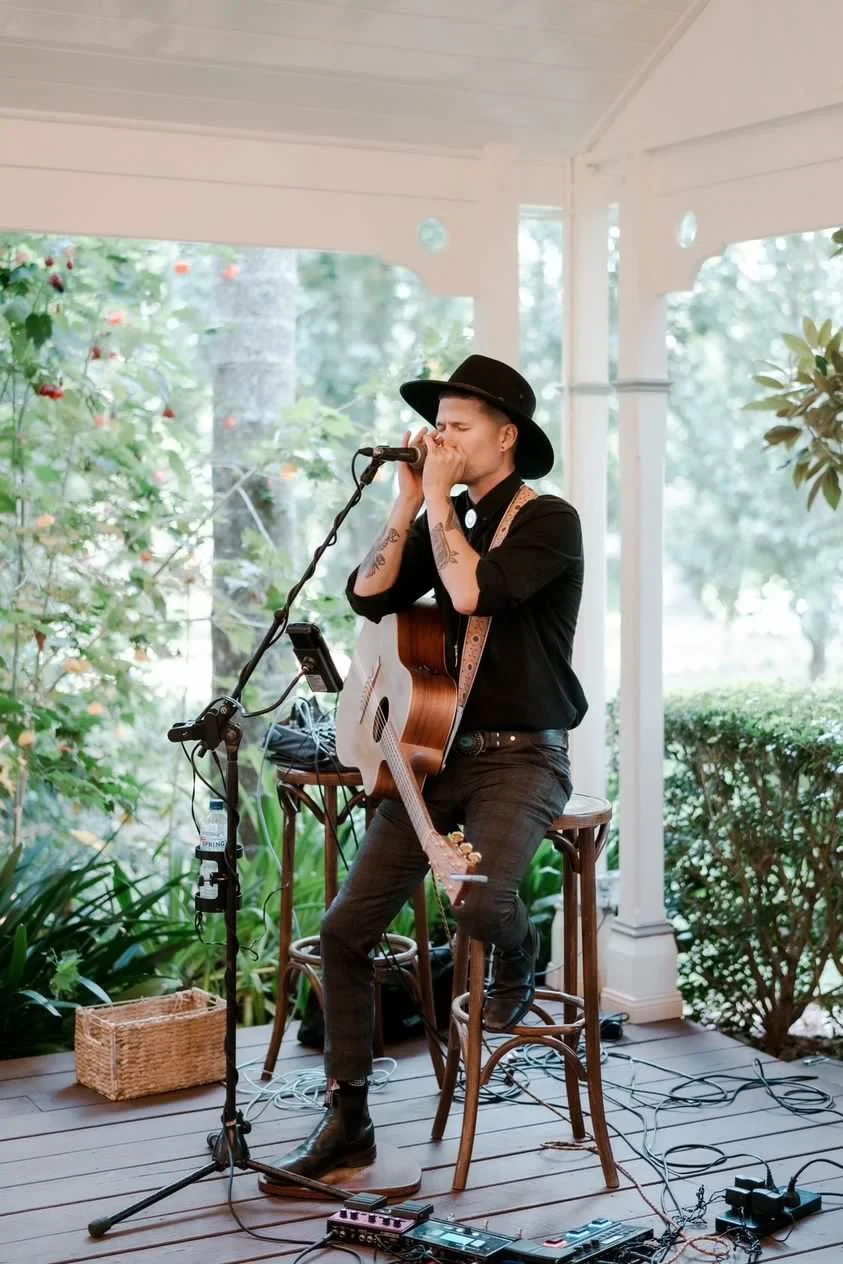 Singer/guitarist using loop pedals, vocal harmoniser, harmonica & stomp box.